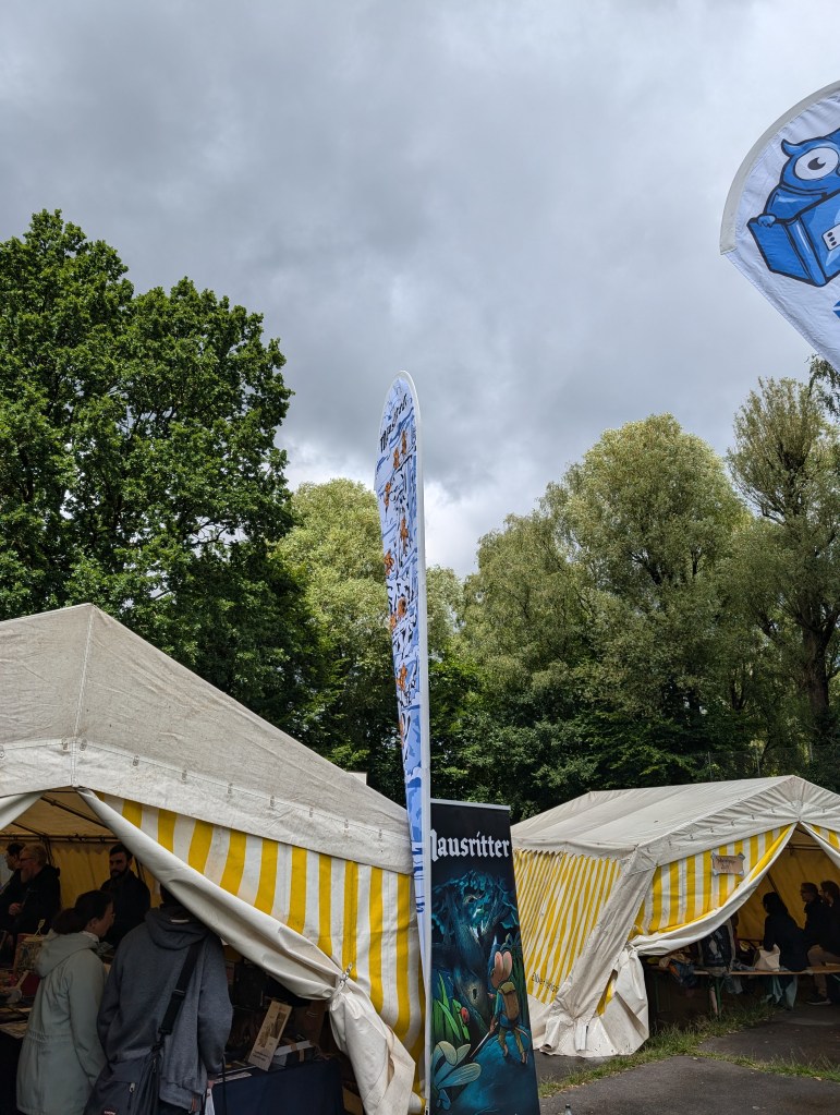 Weiter hinten hat Pegasusspiele ein Zelt aufgeschlagen. Hier gibts neue und alte Brettspiele zum Ausprobieren. Mmmm, vielleicht später. Ein Stückchen weiter gibt es noch einen Eingang. Hier finde ich allerlei neues, gebrauchte, gedrucktes und auch einen der Stände, wegen dem ich hier bin.