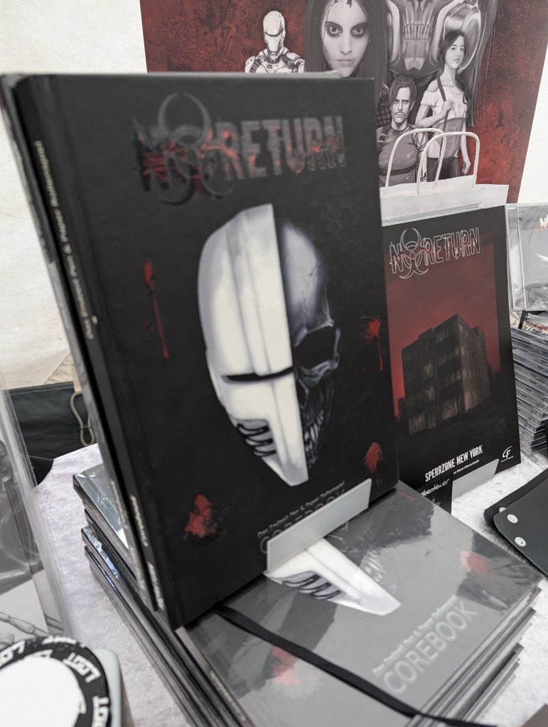 gleich neben an, also im nächsten Zelt, hab ich Manni kennengelernt, Manni ist der Kopf von Mannifest-Games und Macher des NoReturn Rollenspiels, welches er mir und anderen, gerne erklärte und mir dann auch verkaufte. PS: Die Zweite Edition ist in der Vorbestellung, also greift zu. ( unbezahlte Werbung, ich habe die Bücher ja bezahlt. :-))