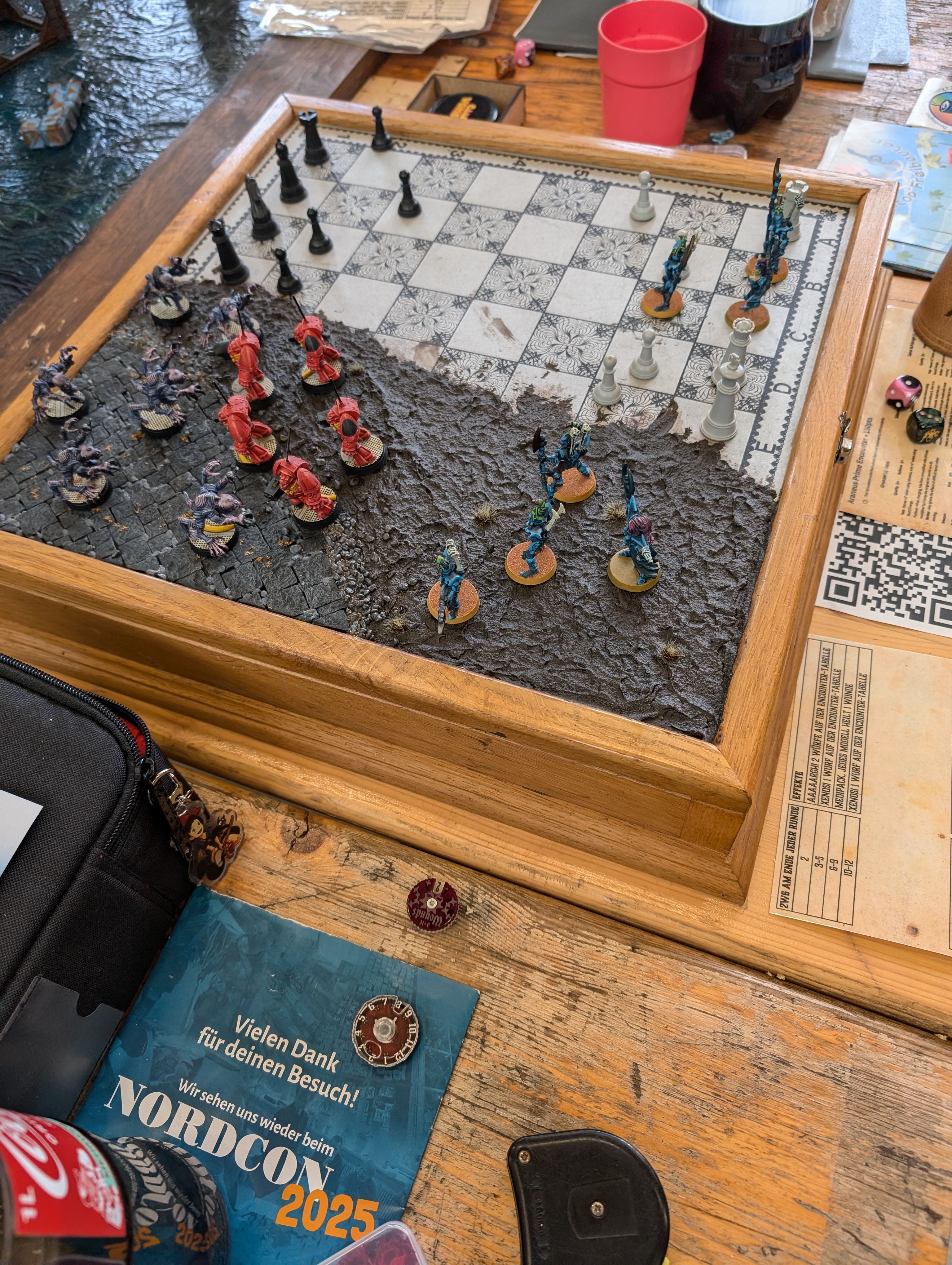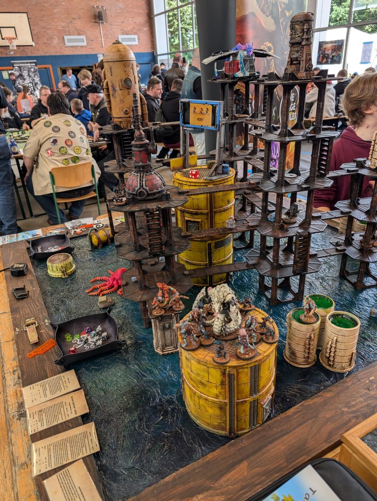 Eine ganze Zeit später, und die Zeit vergeht ja bei netten Gesprächen bekanntlich sehr schnell, ging ich dann weiter. Im Vorraum der nun erreichten Turnhalle gab es eine Garderobe, kostenlos, wie ich hier mal erzählen möchte. und dahinter die große Halle mit Tabletop. Die Tabletopfreibeuter, die Mechforce und andere tolle Clubs stellen und bespielen ihre Platten und zeigen interssierten auch diesen Teil des Hobbys. Hinter der Halle gabs dann noch eine Wiese, dieses Schulgelände ist echt riesig. Durch den Regen gab es reichlich Pfützen, aber die Orga der Con war schnell einfallsreich und legte Europaletten darüber, so dass man trockenen Fußes überall hin kam. Auf der Wiese gab es dann noch ein paar Zelte. Lovecraftgesellschaft , System Matter und Rollenspiele wie Freude schöner Götterfunken, NoReturn und Dieseldrachen konnten hier begutachtet, besprochen und natürlich gekauft werden.