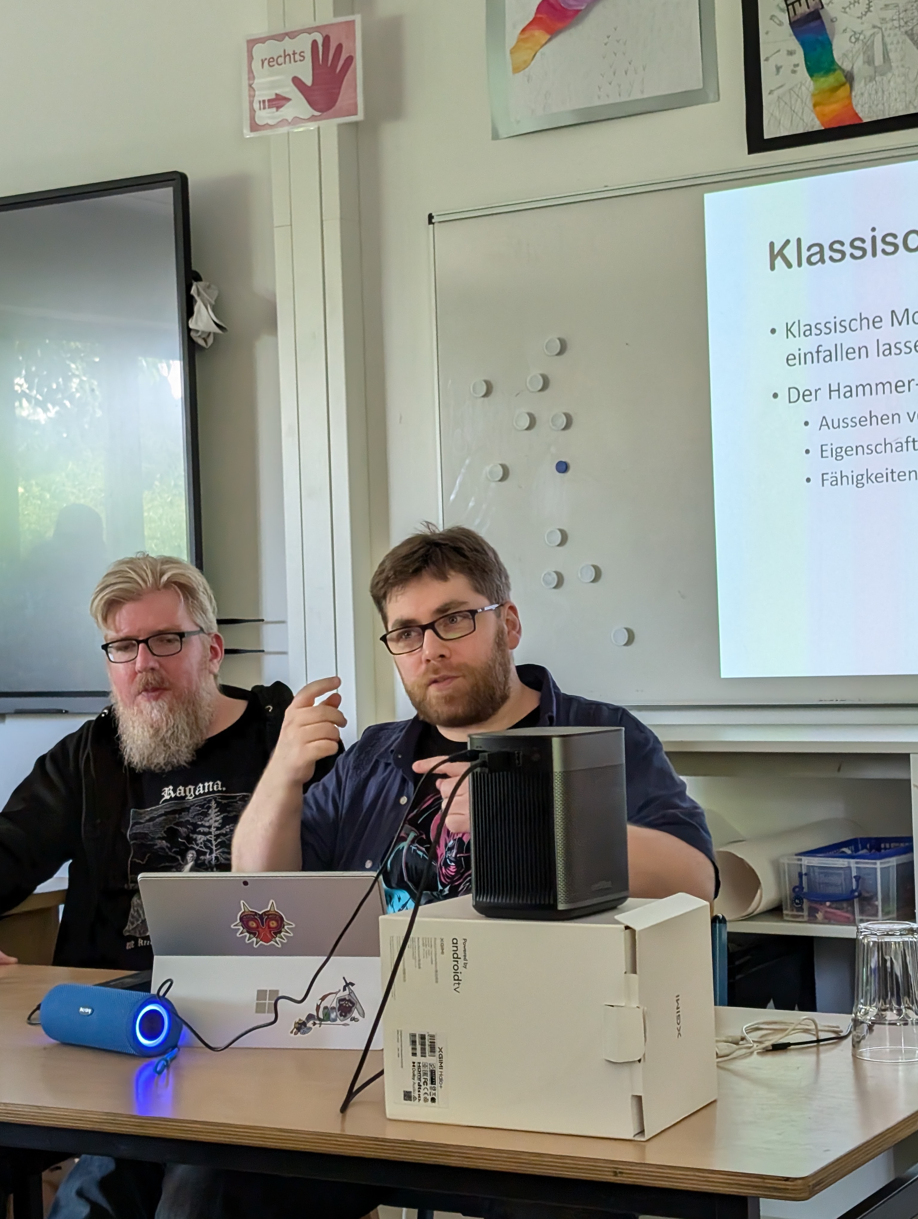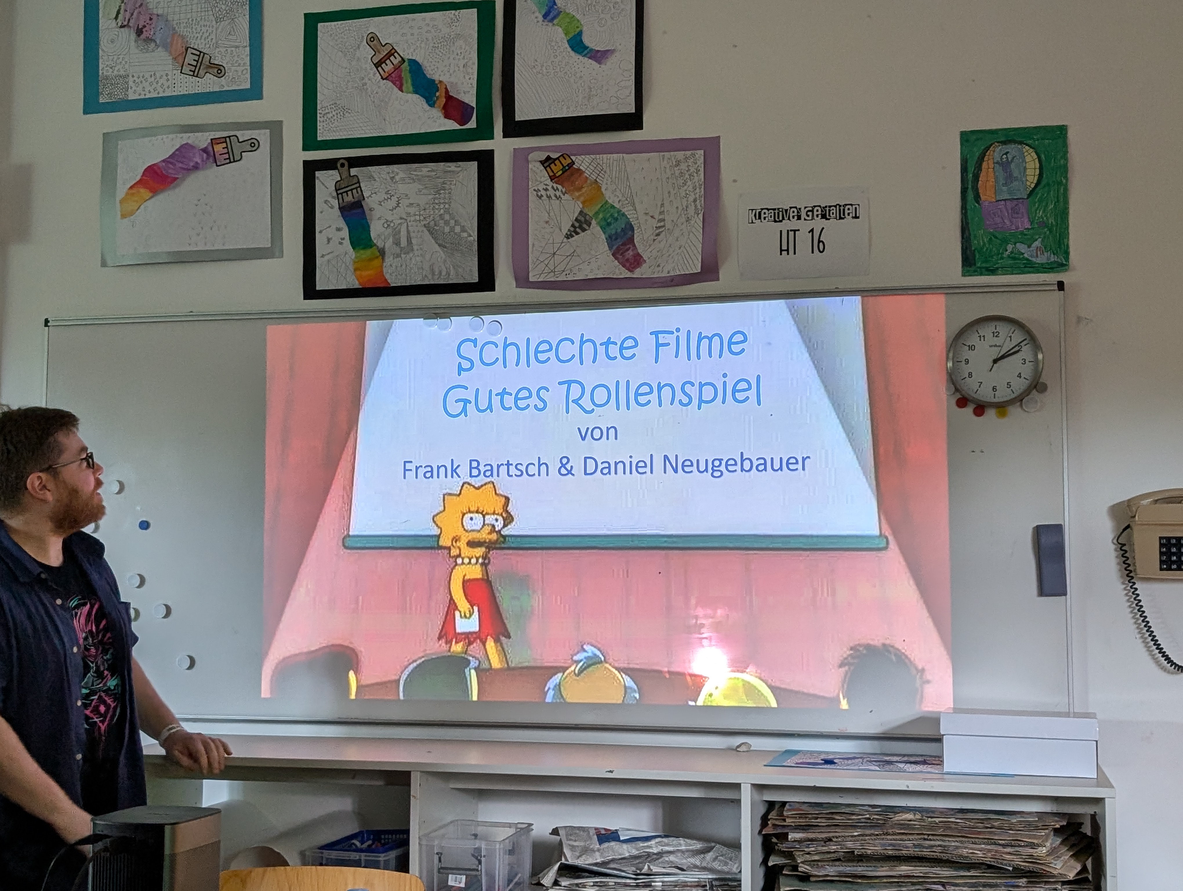 Neben Spielen, durchaus Gutem Essen und netten Menschen, gab es auf der Con auch noch reichlich Vorträge und Workshops. Der eine, den ich mir dann herausgesucht habe war, Schlechte Filme – Gutes Rollenspiel von Frank Bartsch und Daniel Neugebauer. Es gib um Monsterfindung für Rollenspiele mittels alter B-Movies. Ein durchaus spannender Vortrag mit vielen neuen Erkenntnissen.